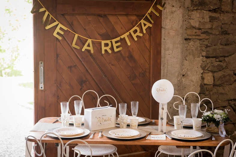 Pour votre jour de fête en décoration de salle, voici une banderole "vive la retraite" de couleur or.