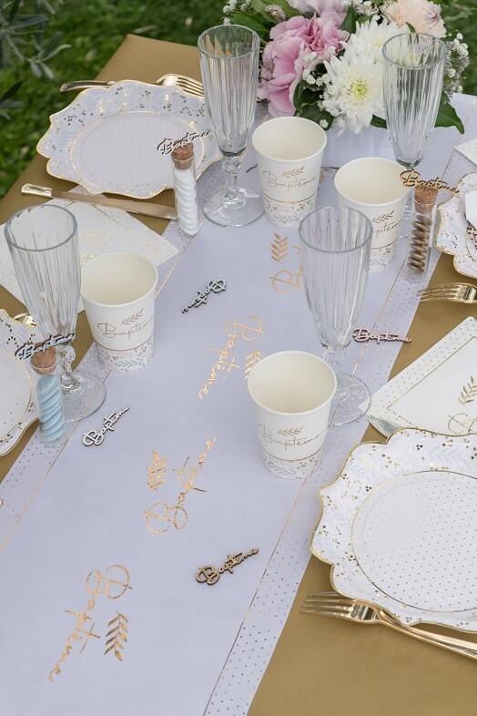 Parfait pour votre décoration de table, ce chemin "Baptême" lui offrira une élégance avec ces motifs en doré or métallisé sur un fond blanc.