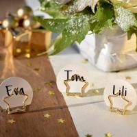 Pour votre table lors d'une fête, voici un marque-place métallique de couleur or en forme d'étoile où vous allez pouvoir y glisser un carton de forme ronde et ainsi noter les prénoms de vos invités.