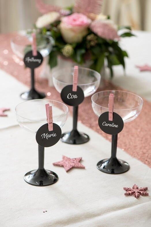 Pour noter les prénoms de vos invités lors de votre jour de fête, voici un marque-place rond et de couleur noir.