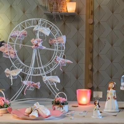 Idéal en décoration ou en présentoir à dragées, voici une jolie et grande roue de couleur blanche en métal et en location pour toutes vos fêtes: mariage, Baptême, noël, soirée entre amis, anniversaire, Communion…