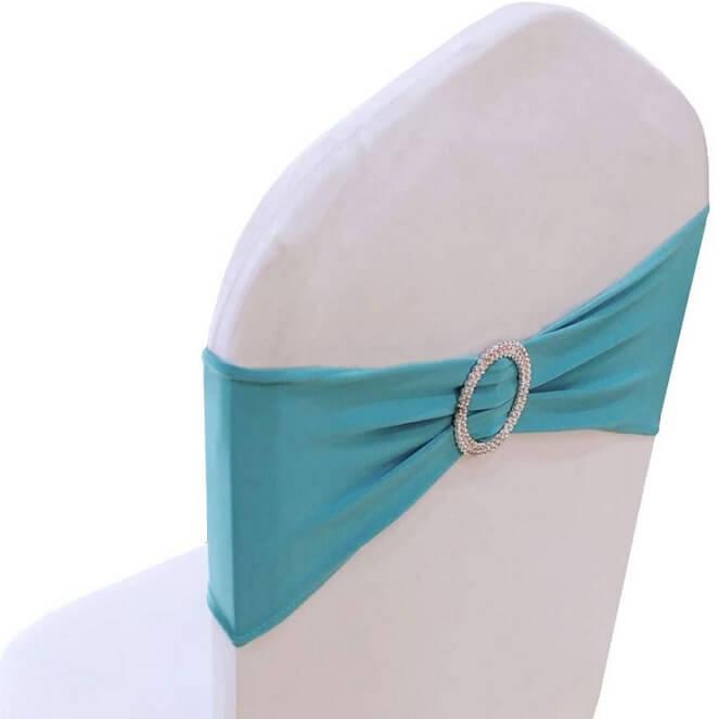 Vous avez loué notre housse de chaise Spandex Lycra ? Events Tour vous propose donc une location d’un nœud « bandeau » de couleur bleu turquoise avec en finition son anneau décoratif.